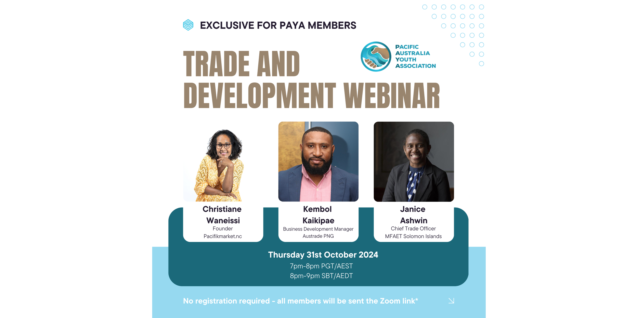 Join us for an exclusive PAYA members-only webinar this Thursday on Trade and Development in the Pacific! We'll dive into trade policy, discuss the challenges Pacific businesses face, and share success stories of Pasifika entrepreneurship! By the end, you’ll gain a clear understanding of international trade’s impact on development and uncover new ways to drive economic growth in our region